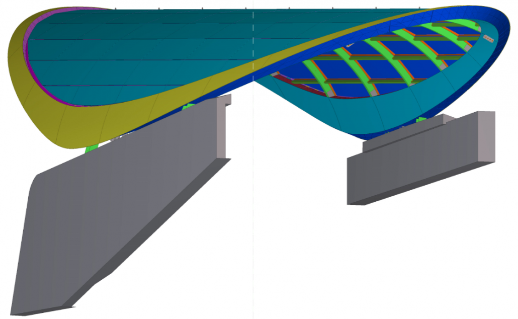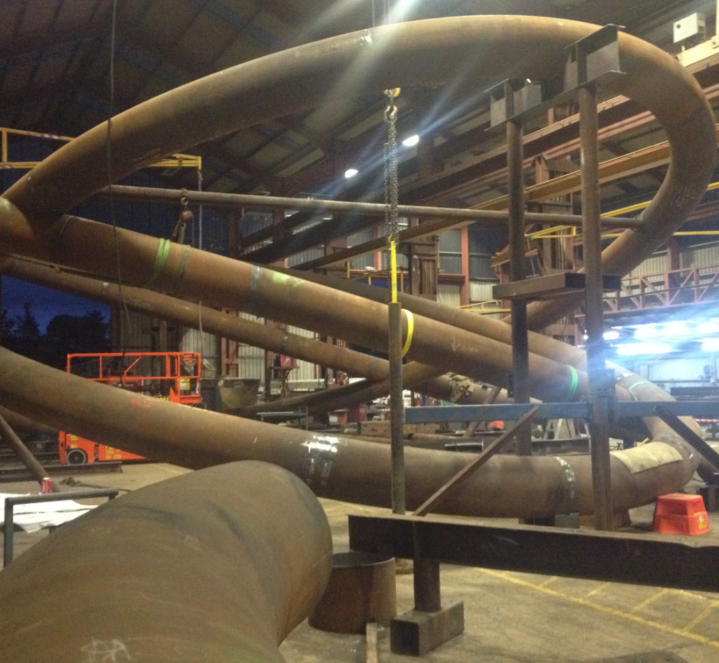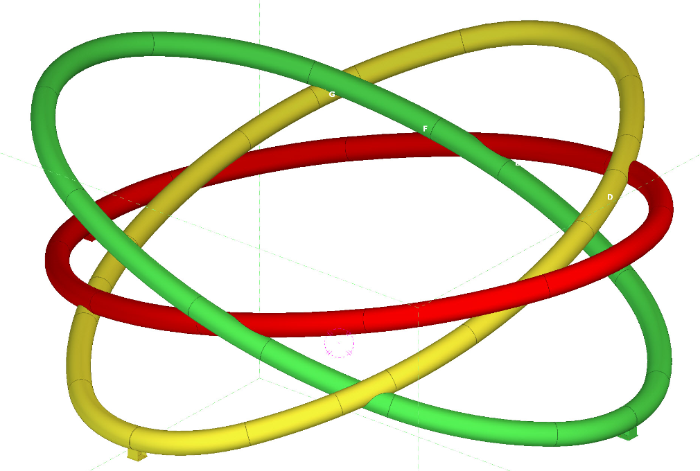 This project is made of three large elliptical rings which intersect together. Each ring is made of an ellipse, 12 meters in the minor axis and 18 metres in the major axis. The cross section is made of 610CHS*12.7.